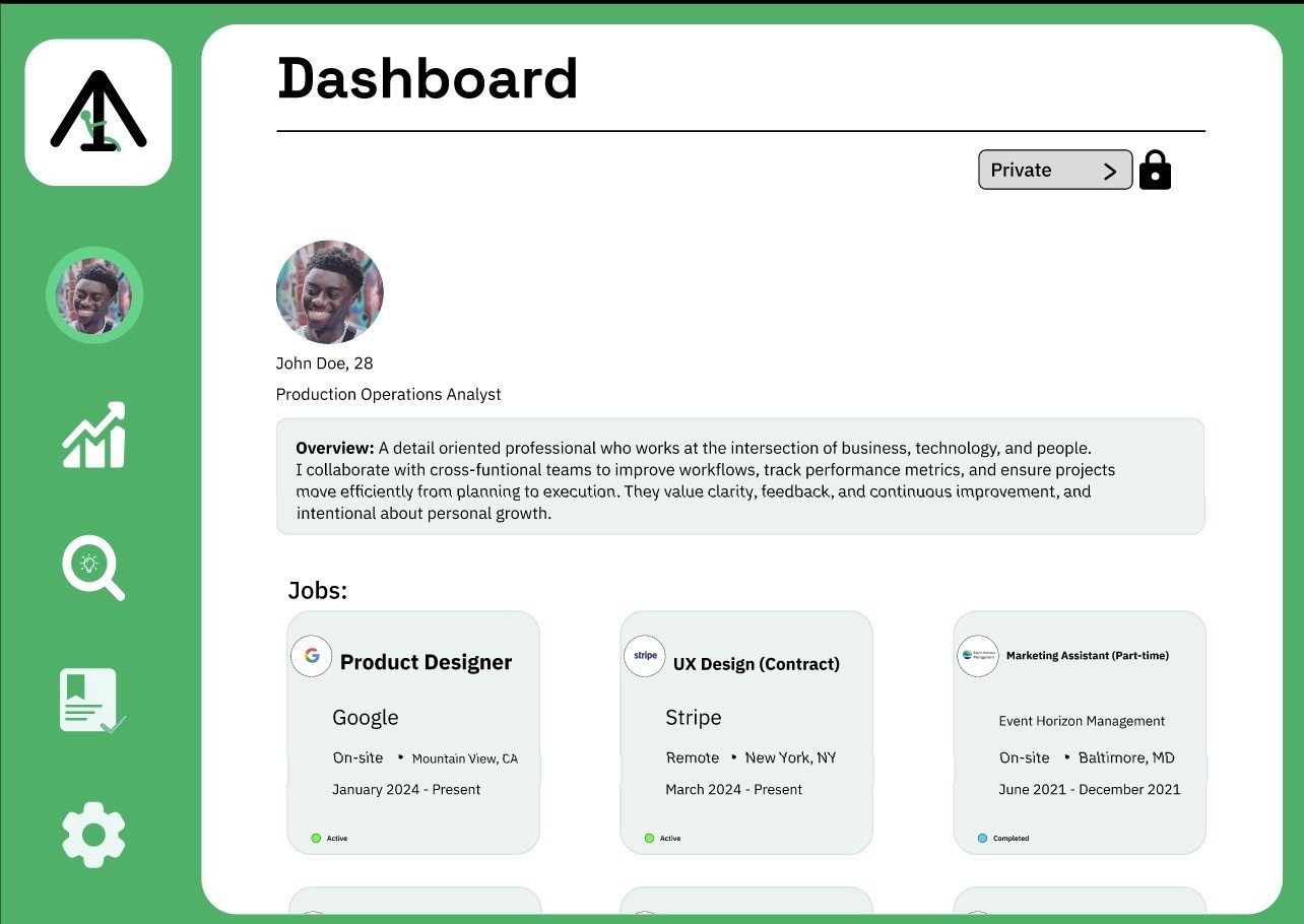 navigation, users can easily access their profile, job-related insights, growth monitoring, and
