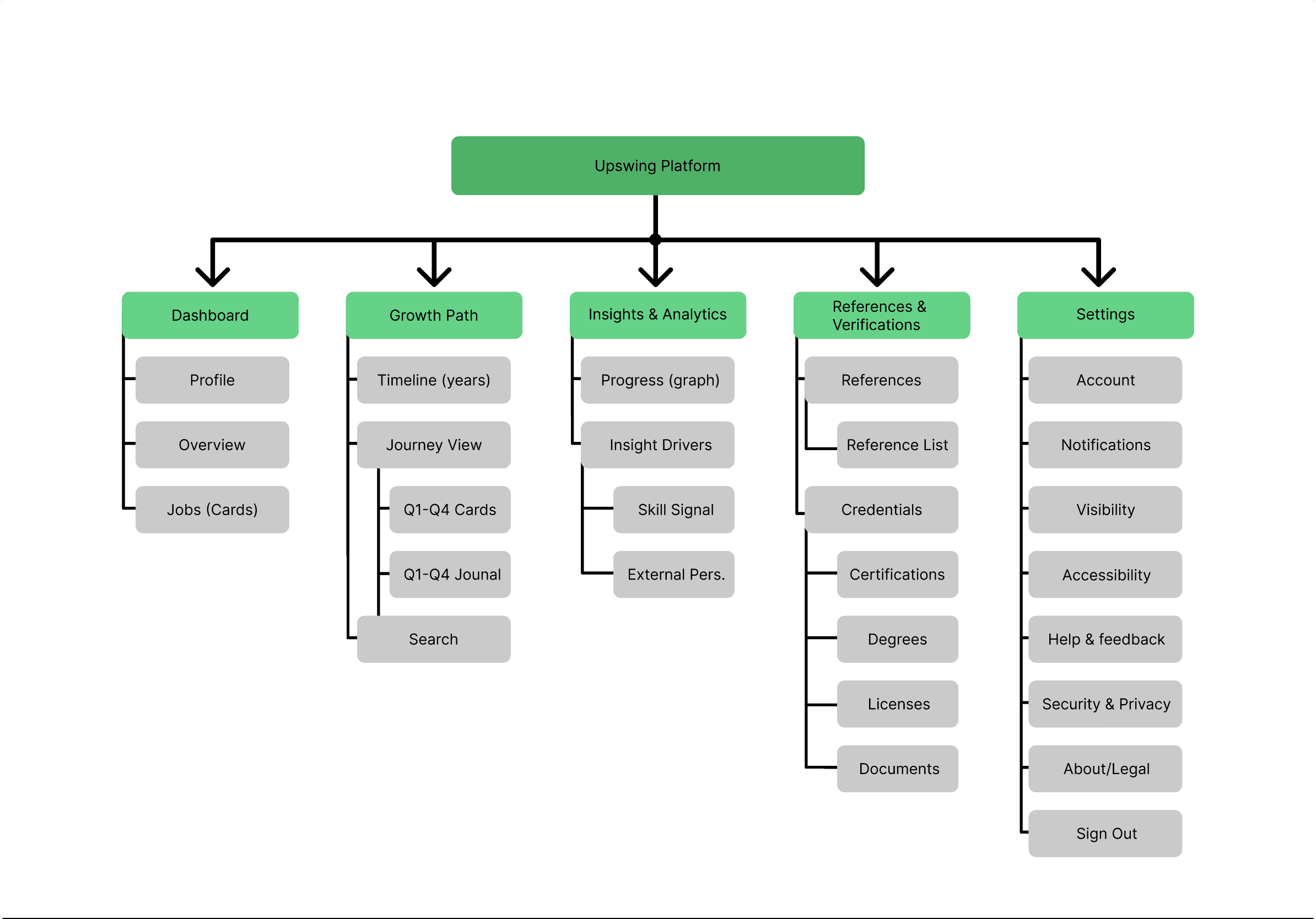 The five main sections of Upswing's information architecture: Dashboard, Growth Path,